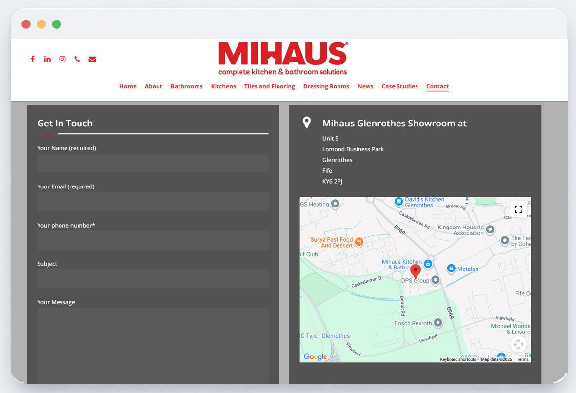 Five12 delivered a premium WordPress website for Mihaus that mirrors the quality of their Glenrothes showroom. The design is clean, image-led, and service-focused, guiding customers straight to Kitchens, Bathrooms, Projects, and the Showroom, with clear next steps on every page.